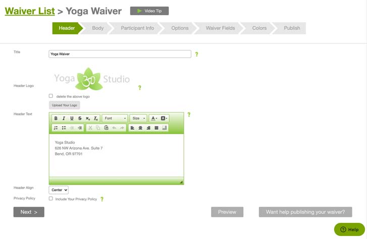 The new editor provides a new customer access to a waiver within minutes of signing up. It improves the ability for the customer to navigate their template settings without help of Support and allows the customer to see their changes in real time in a mock waiver template.